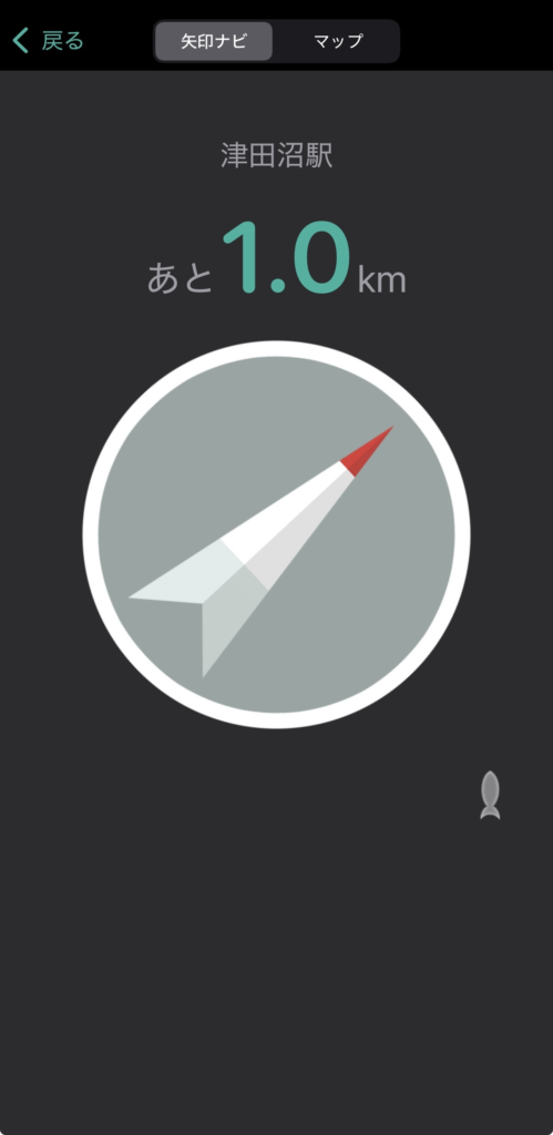 このアプリは通常の地図アプリとは違って、「目的地の方角と距離」のみが表示されるナビアプリです。